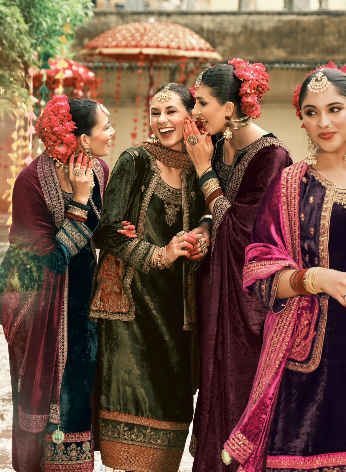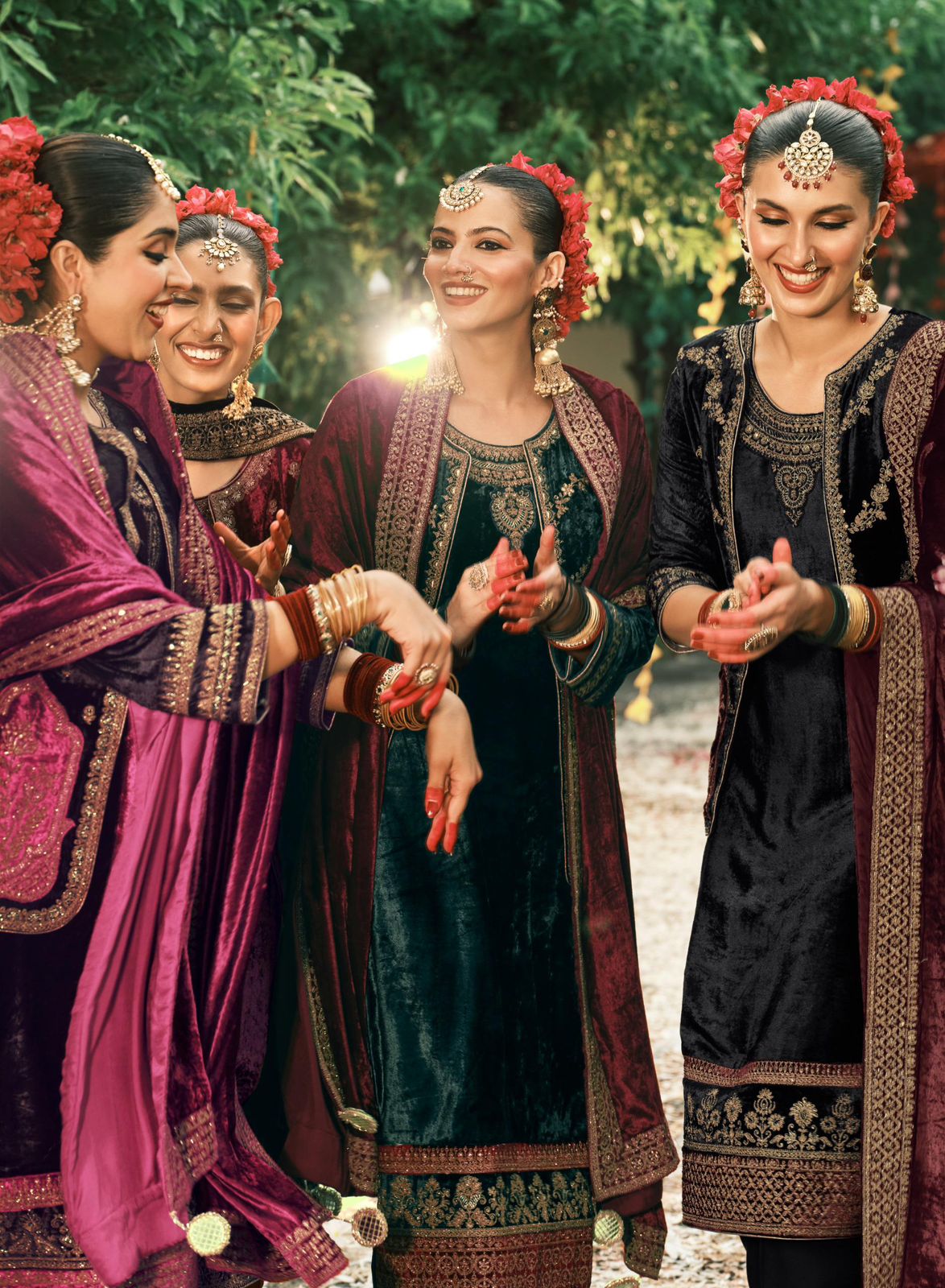 • Elegant Three-Piece Set, Ibiza Velvet Suit Set: Includes a velvet kurta, matching pants or palazzo, and a complementary dupatta in velvet or contrast organza/net.