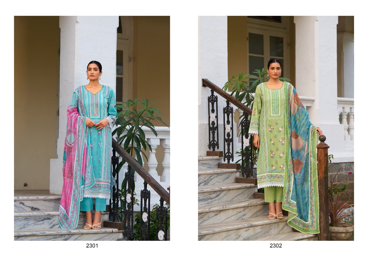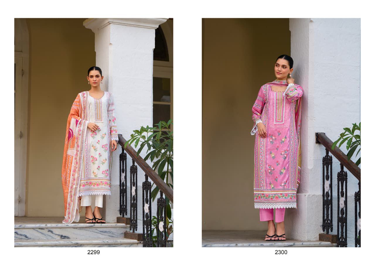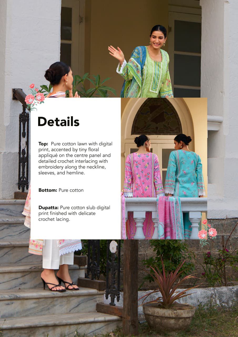 Top – Pure Cotton lawn with digital print accented by tiny floral applique on the Centre panel and detailed crochet interlacing with embroidery along the neckline sleeves and hemline