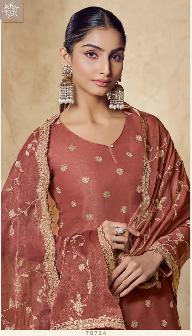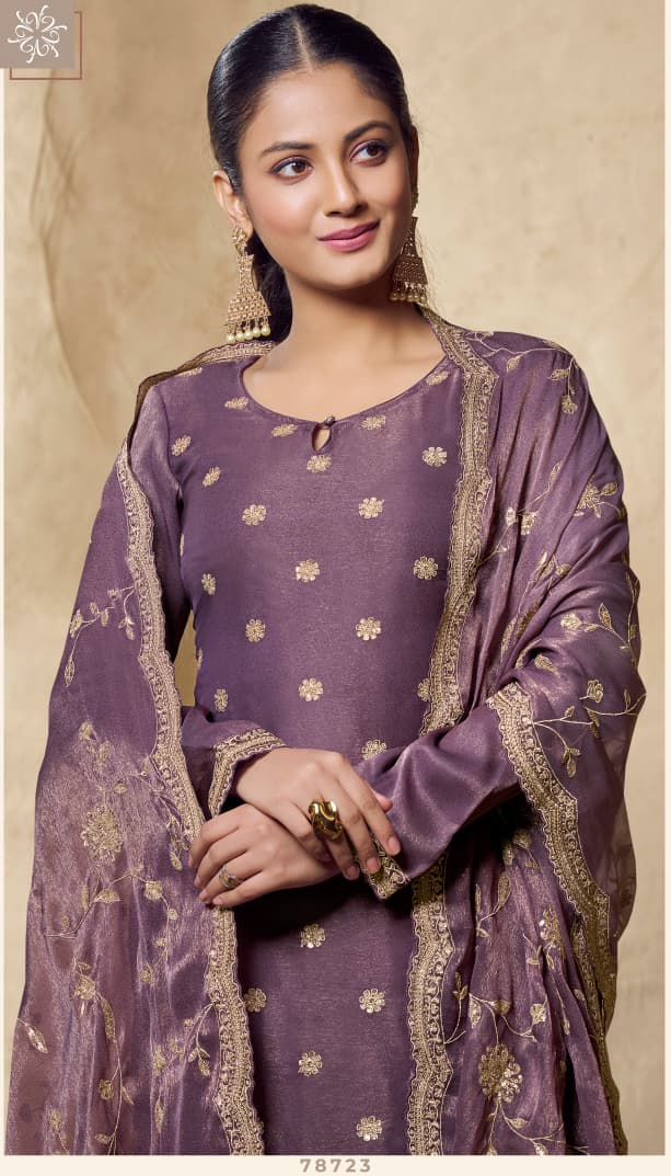 *PREMIUM GOLD SILK SUIT ADORNED WITH INTRICATE HEAVY EMBROIDERY ON THE KURTA, PAIRED WITH A MATCHING DUPATTA HIGHLIGHTED BY ELEGANT FLORAL ZARI-RESHAM EMBELLISHMENTS AND A FINELY EMBROIDERED SANTOON FABRIC BOTTOM.*
