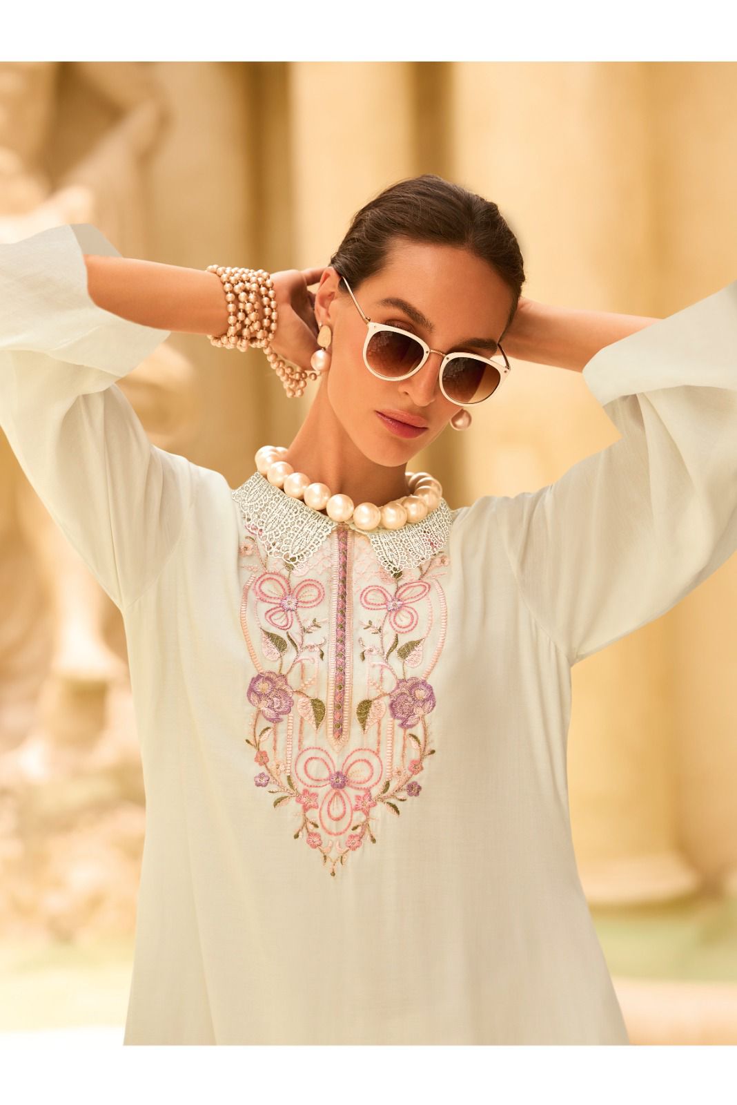 Top – premium Swiss cotton. Digitally printed with embroidered neckline and laces